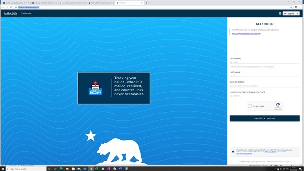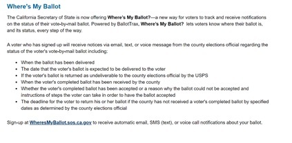 The link at the bottom, wheresmyballot.sos.ca.gov, actually leads you to https://california.ballottrax.net/voter/, which could be confusing. BallotTrax is a privately-owned service operated by Colorado-based software company i3Logix. A number of jurisdictions are working with this service in in 2020. The California-specific landing page looks like the screenshot below.
