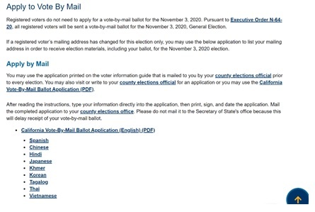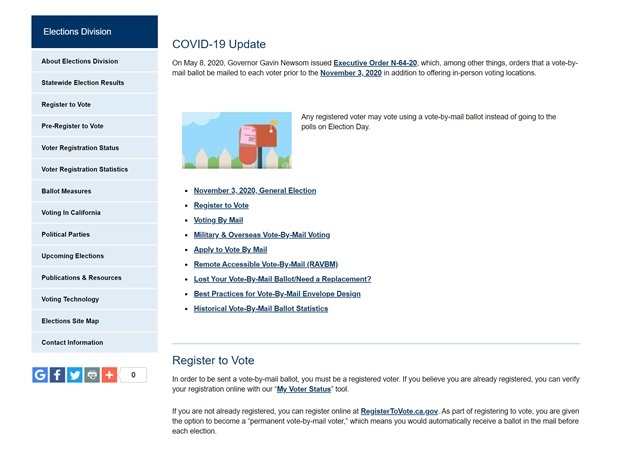 It could be argued that a user looking for mail-in ballot information in California has completed their task—it says clearly, if not too obviously, on the main page that all voters will automatically get a ballot.