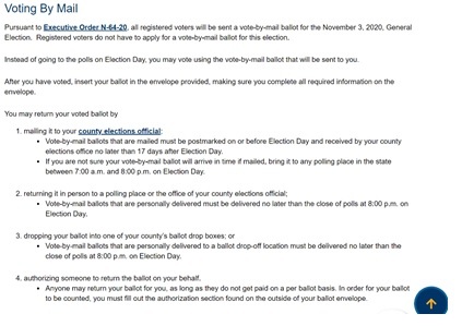 | The information highest on the page notes that each voter in California will be automatically provided with a vote-by-mail ballot. | This text could be larger, distinguished by color or border or more ideally both. This is important information that any California resident looking for vote-by-mail information should know. |