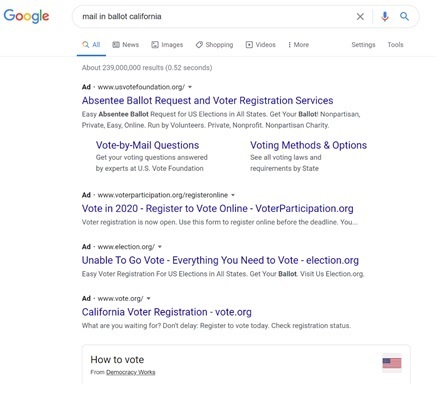 Below is the page that resulted from a search for “mail-in ballot California” with a standard Chrome browser.