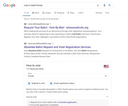 Finally, and this is somewhat off topic, we found it troublesome that Google is placing paid ads for voter and mail-in ballot registration above trustworthy, official links. The promise of Google or any search engine is that an intelligent algorithm is taking your terms and returning the most relevant information. If we were buying a mattress or looking for Halloween costumes, it would make sense that we might also receive “Ooh ooh — we sell that!” messages; however, this is different.
