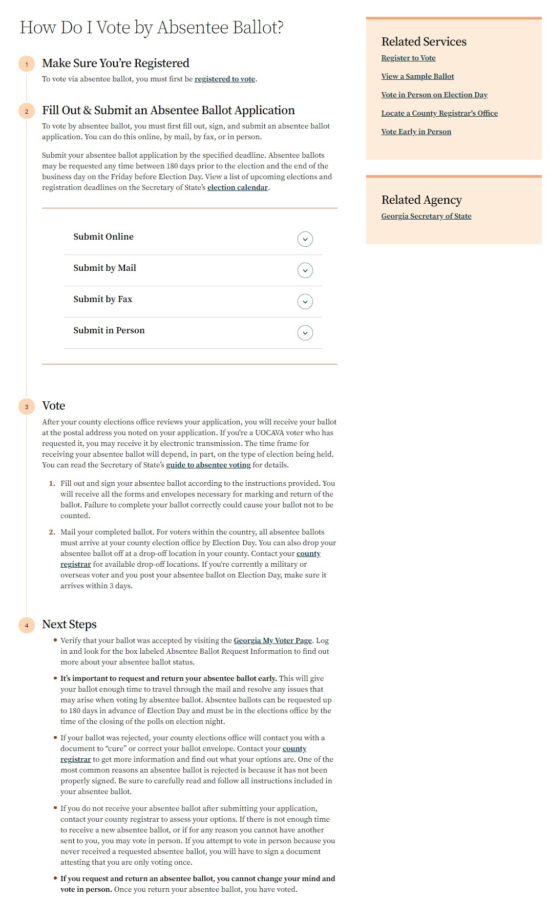 Happily for Georgia voters, everything you need to vote by mail is available from the main landing page. There are no other hoops to jump through—each step in the process is richly linked and has solid expository text.