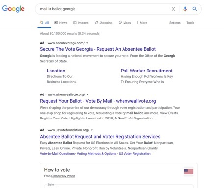 We are sure that Google would argue that the paid links are trustworthy and lead to sites that do a better, more efficient job of getting voters registered and set up to vote by mail. The problem is that analyzing whether those sites are reliable is outside the scope of what users are attempting to do. It distracts and attempts to profit from a sacred, constitutional task. Distracting users from the task is a no-no, they need only ask their own UX writers and designers.